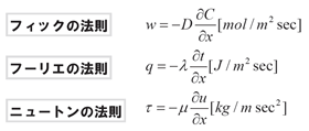 このニュートンの粘性法則とフイックの法則およびフーリエの法則として知られている式は、それぞれ物質、運動量および熱の移動(拡散)を示しています。