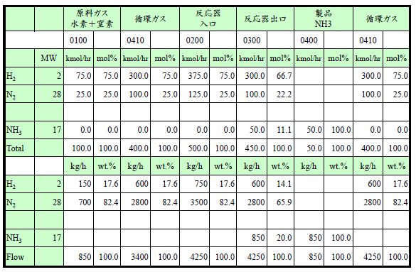 アンモニア合成プロセスでは下図にあるように3モルの水素と1モルの窒素から2モルのアンモニアが生成されますので、合計100kmol/hの水素と窒素の原料ガスが全量、アンモニアへ変換するとなると、xmol/h、すなわち50kmol/hのアンモニアが生成します。