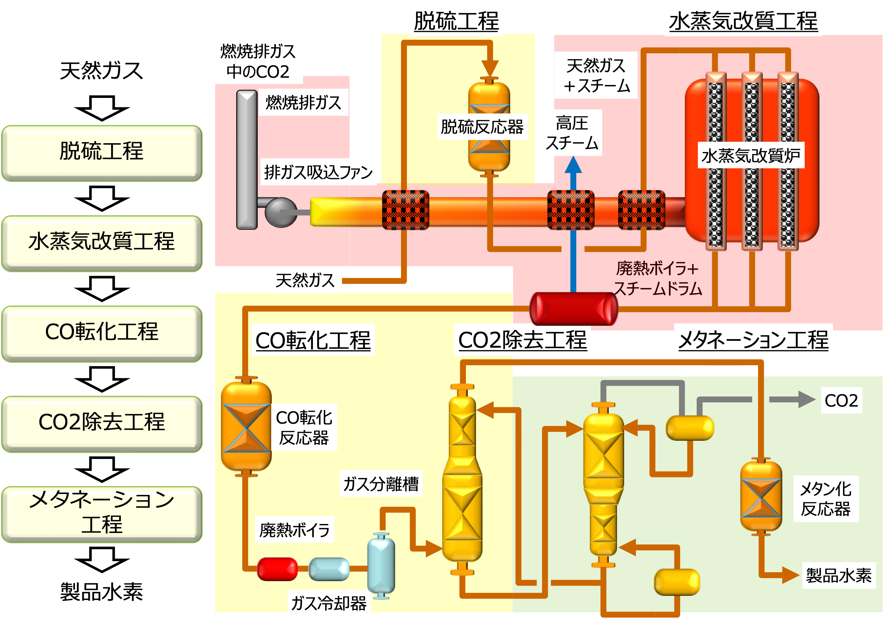 天然ガスはまず脱硫され、水蒸気改質とCO転化の工程を経て、主に水素、CO, CO2, CH4,H2Oを含む合成ガスが生成される。その後、CO2除去工程でCO2を分離し、次のメタネーション工程で、残ったCO, CO2をメタンに変換して製品水素ガスを製造する。
