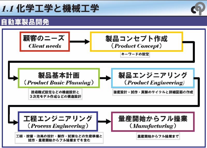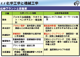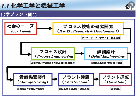 - 社会ニーズとプロセス技術の研究開発:社会あるいは顧客のニーズを把握して必要な化学プロセスの技術開発を行う。この段階ではラボテスト、ベンチテスト、概念設計などを行う。
