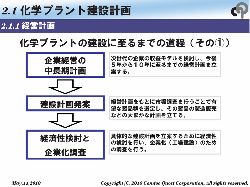 企業の経営計画には短期計画と中期計画、そして長期計画があります。一般に化学プラントの建設計画は企業経営の中長期計画に盛り込まれます。中長期計画では今後5年から10年後の企業のあるべき姿(イメージ)を描き、そのイメージを具体化するために経営資源の再分配や市場戦略の立て直しなどを行います。