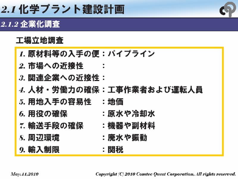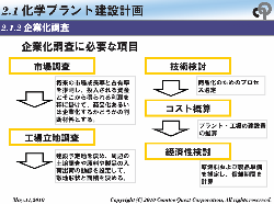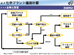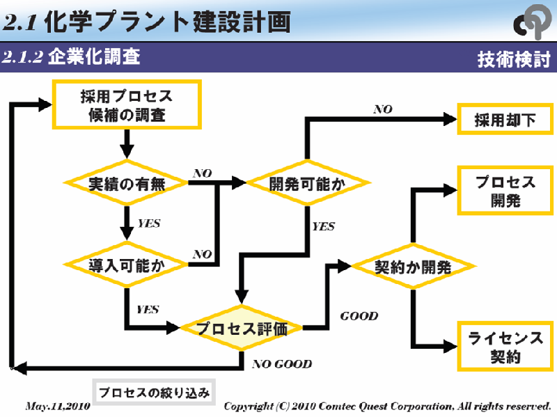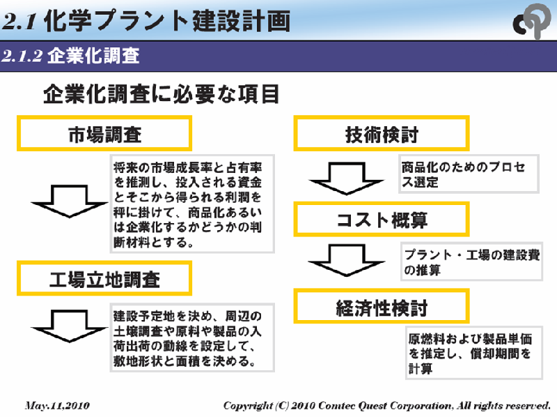 - 経済性検討:原燃料および製品単価を市場調査の結果を元に推定し、償却期間を計算するなどを行い、経済性(キャッシュフロー)の検討を行う。