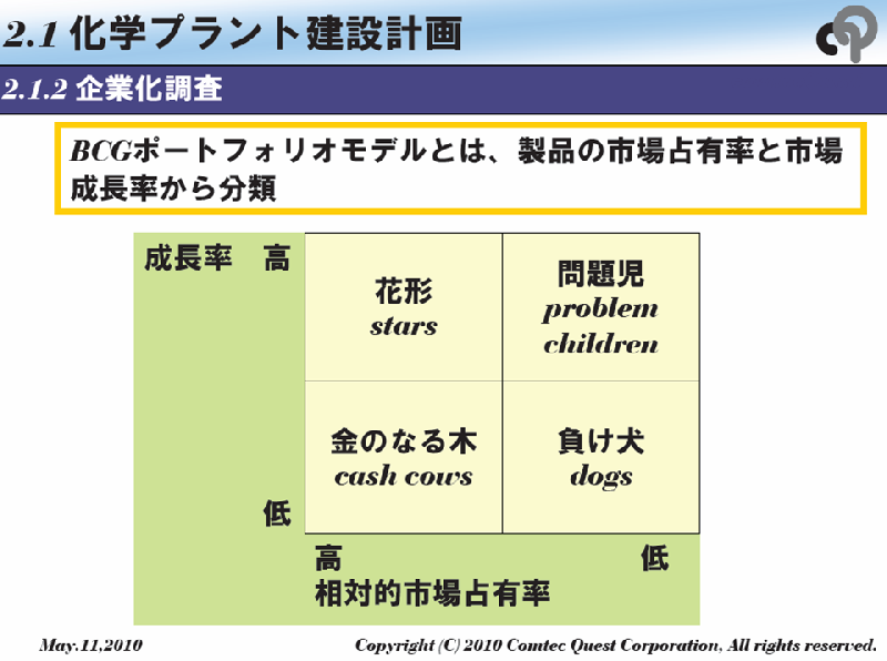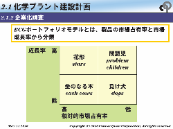 市場調査の結果を踏まえ、建設対象となるプラントで製造される商品は成長性が見込まれる”花形”商品でなければならない。ただし、経営方針によっては、”問題児”あるいは”金のなる木”のケースもあり得る。