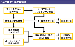 - 機器、装置&バルク(配管や計装材料)コスト推算:主要機器のサイジングやユーティリティー設備の計画をもとにコストを推算する。