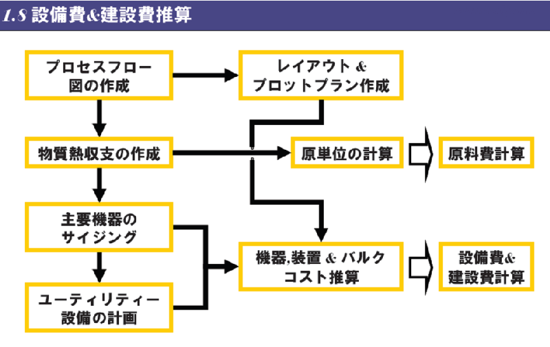 - 設備費と建設費の計算(積算):コスト積算方法をもとにプラント建設費を計算する。