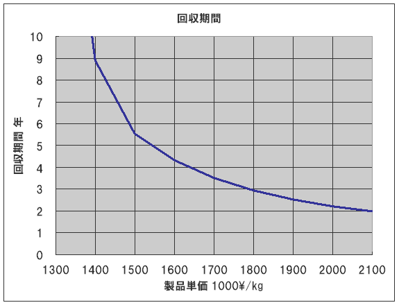 回収期間に大きく影響する要因の一つとして製品の単価があります。想定する製品単価を高くすれば回収期間を短くすることが出来ますが、その一例をグラフに表しました。ここでは製品単価を1.3~2.1百万円/kgの範囲で、前記の計算に倣ってを回収期間を計算してみました。これによれば、製品単価を高く設定すると、急激に回収期間が短くなることがわかります。