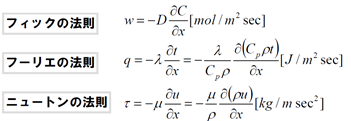 このニュートンの粘性法則とフイックの法則およびフーリエの法則として知られている式は、それぞれ物質、運動量および熱の移動(拡散)を示しています。