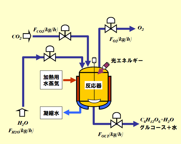 そこで話を簡単にするために、反応温度をグルコースが溶解する温度(約140℃)以上の160℃とし、圧力は160℃の水の蒸気圧(約620kPa)より高い700kPa(約7気圧)と設定します。また、光合成を行うために必要な光エネルギーは特殊な電球を使用し、閉じられた容器内で反応が進行するとします。また、この反応は連続的に行われるものとしますので、原料である二酸化炭素や水ならびに触媒が連続的に容器内に供給され、生成した酸素は反応器上部から回収され、製品であるグルコースと水は液状にて容器から抜き出されるものとします。