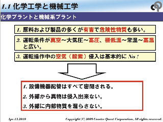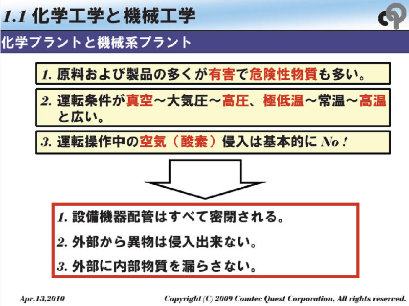 機械系プラントでの運転条件はそのほとんどが大気圧でかる常温に対して、化学系プラントの運転条件は地球以外の惑星の大気条件に類似しています。例えば圧力は真空から超高圧(100MPa)、温度は絶対零度から二千度以上の広範囲に渡っています。