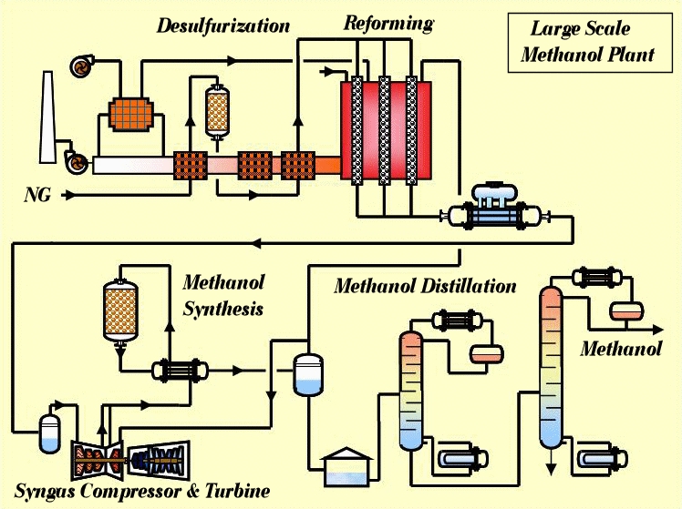 メタノール製造プロセスの説明脱硫工程原料である天然ガスは90%程度がメタンで、それ以外にエタン以上の炭化水素や窒素N2や二酸化炭素CO2などを含んでいます。また、数ppm~数十ppmの硫黄化合物やごくわずかな塩素化合物などを含んでいます。 水蒸気改質工程水蒸気改質工程(Steam Reforming)では天然ガスにスチームを加え、高温下(750~900℃)で改質して水素や一酸化炭素などを生成します。この改質反応(吸熱)に加えCO転化反応(発熱)も起こりますが、総合的には吸熱反応となります。そこで天然ガスとスチームの混合ガスを外部から加熱するために、混合ガスを通す改質管と燃焼バーナーから構成される水蒸気改質炉が採用されます。また、改質管内部には水蒸気改質触媒(Ni系)が充填されています。 合成ガス圧縮工程合成ガス圧縮工程(Syntgas compression)は改質ガスを圧縮する工程で、主要機器は合成ガス圧縮機と駆動機、付随する中間冷却器および気液分離器です。大型のプラントでは、この駆動機にスチームタービンを採用しています。 メタノール合成工程メタノール合成工程(Methanol Synthesis)は合成触媒とそれを充填したメタノール合成反応器、合成反応器に供給されるガス(合成ガス)を加熱する加熱器と生成したメタノールを冷却凝縮させるための冷却器、凝縮したメタノールを未反応な合成ガスから分離する気液分離器、未反応な合成ガスを再循環させる循環機から構成されています。 メタノール蒸留工程メタノール蒸留工程(Methanol Distillation)は二本あるいは三本の蒸留塔と、加熱器(リボイラなど)、凝縮器や冷却器、環流槽と環流ポンプなどから構成されています。粗メタノールには、メタノール以外に水やエタノール、そしてブタノールなどの高級アルコールや炭化水素、溶解したメタンや二酸化炭素などが含まれており、これらを不純物を除去するのがこのメタノール蒸留工程の目的です。この蒸留操作で大量の熱が使用されますので、例えば水蒸気改質工程から廃熱を回収してエネルギー効率を改善する必要があります。 |