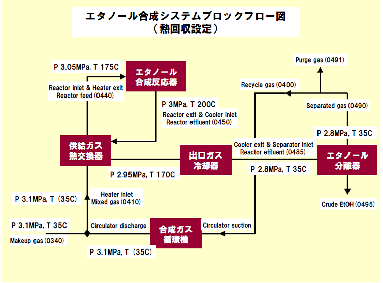 これから考えられることは、供給ガス加熱器負荷(35℃→175℃)の一部または全部を出口ガス冷却器負荷(200℃→35℃)で補うことが出来れば、熱効率の改善に寄与すること、そしてエタノール合成反応器負荷(175℃→200℃)を回収できれば、これも熱効率の改善に寄与できる。