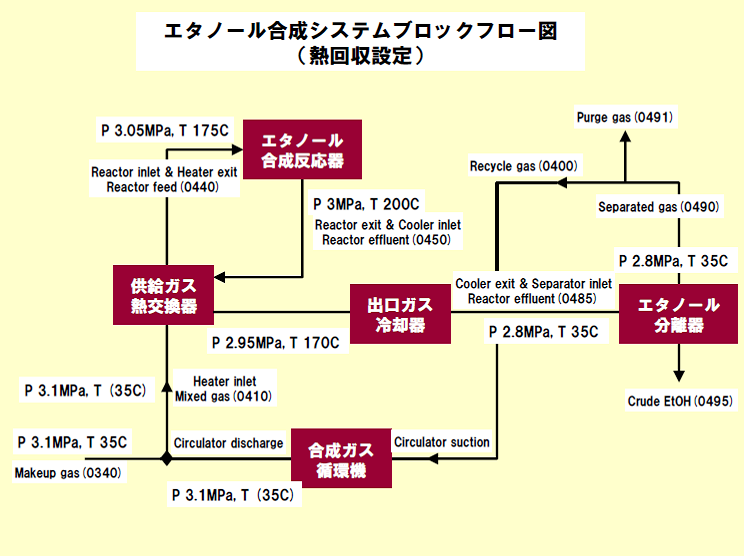 この熱回収を行うことでエタノール合成循環システムに供給される熱負荷が減少し、エタノール製造における原単位が向上します。具体的には、