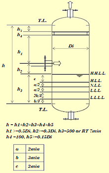 - H.H.L.L(high high liquid level):液面の異常高。この高さに液面が到達した場合には下流の機器にダメージを与える恐れがある。下流の機器が遠心圧縮機の場合には、この液面警報で圧縮機を停止させる。