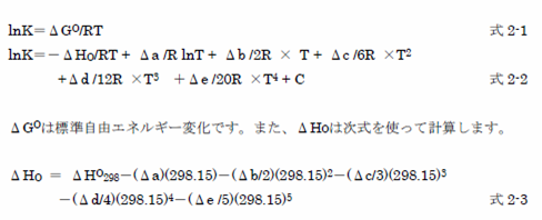 - 式2-1から、25℃、1気圧における標準自由エネルギーを使って平衡定数Kを求めます。