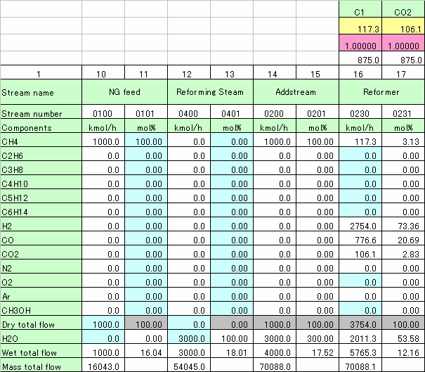 - Kpm/Kpm'およびKps/Kps'が共に1になるように、1.で仮定したCH4流量と2.で仮定したCO2流量を変えながら、Kpm/Kpm'およびKps/Kps'が共に1になるまで計算を繰り返します。