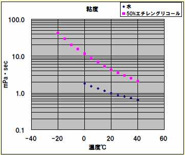 ところが、冷凍冷却装置などに使用するブラインは低温下で示す粘度が大きく、伝熱設計上大きな問題となります。一般に使用されるブラインは、50%(重量)前後のエチレングリコール溶液で、温度と共に飛躍的に粘度が大きくなります。その温度と粘度の関係の一例を下図に示します。