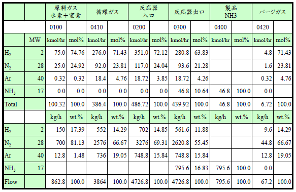 - Arの許容レベルが0.04ですので、アンモニア合成反応器入口ではAr 4mol、水素と窒素の合計100molとなり、反応器出口ガス、循環ガスおよびパージガスではAr 4mol、水素と窒素の合計80molとなります。