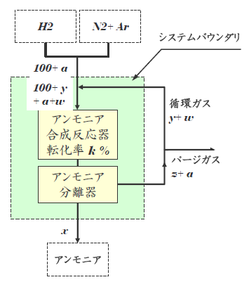 システムに供給される水素と窒素の合計量を100kmol/hとします。ただし、その比はアンモニア合成の量論比(3:1)にします。Ar量(a)は一般的な空気の組成(N2:O2:Ar = 78:21:1)から0.32kmol/hと設定します。また、パージガス中の水素と窒素の合計量をz kmol/h、勿論、そこに含まれるべきAr量(a)は 0.32kmol/hとなります。パージ後の循環ガス中の水素と窒素の合計量をy kmol/h、そしてAr量をw kmol/hとします。また、製品アンモニアの生産量は前回では50kmol/hでしたが、このシステムでは水素と窒素の一部がパージガスに含まれてシステム外に排出されますので、製品アンモニアの生産量が減少します。そこで、このアンモニア生産量を変数 x kmol/hとします。