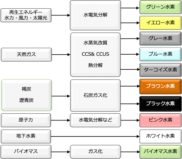 水素の種類を原料の種類と生産方式で分類する。その定義については国際的なコンセンサスが得られていないので、探し出すとまだまだありそうだが、ここでは幾つかの色の付いた水素について説明する。