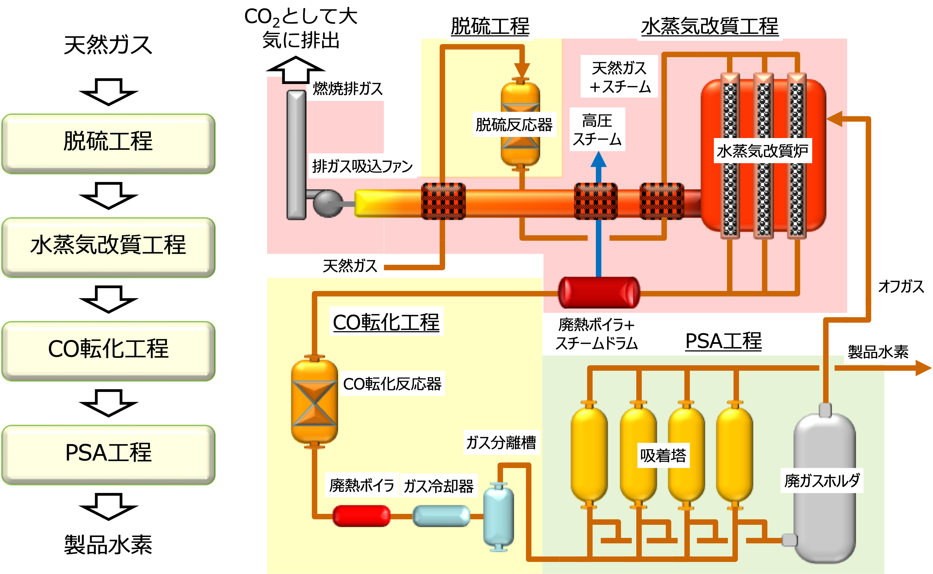 天然ガスはまず脱硫され、水蒸気改質とCO転化の工程を経て、主に水素、CO, CO2, CH4,H2Oを含む合成ガスが生成される。このガスはPSA装置に供給され、水素以外の成分が除去され、純度99.999%の水素を製造される。PSA装置で分離されたガス(オフガス)は水蒸気改質炉の燃料の一部として再利用される。